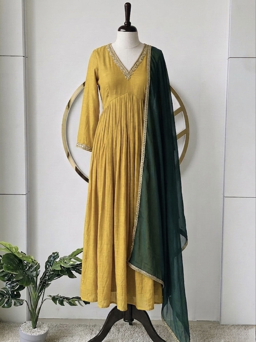 Handworked mul chander kurti & lace attatched organza dupatta set.